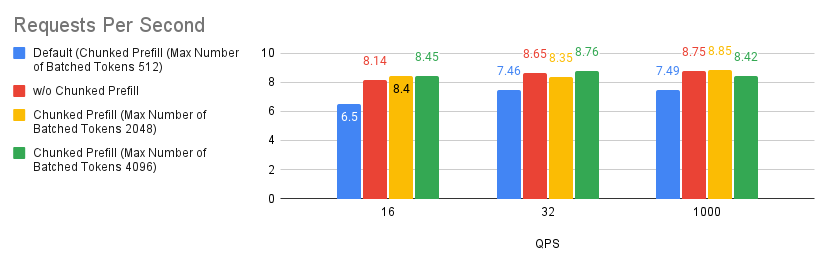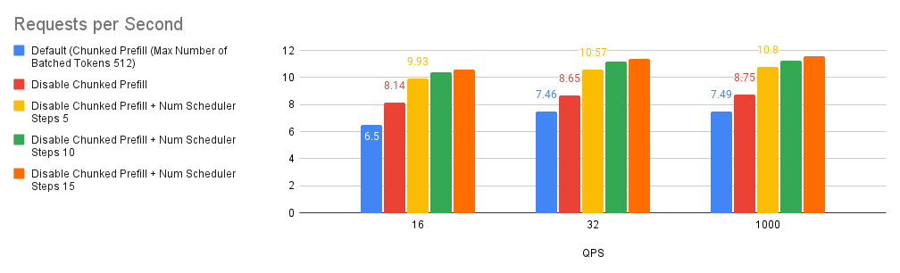 --num-scheduler-stepsto a value between 10 and 15 to optimize GPU utilization and performance. - Prefix Caching: Combining prefix caching with chunked prefill can enhance performance in specific scenarios. However, if user requests have a low prefix caching hit rate, it might be advisable to disable both chunked prefill and prefix caching.