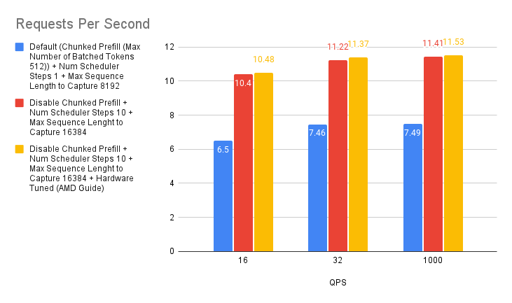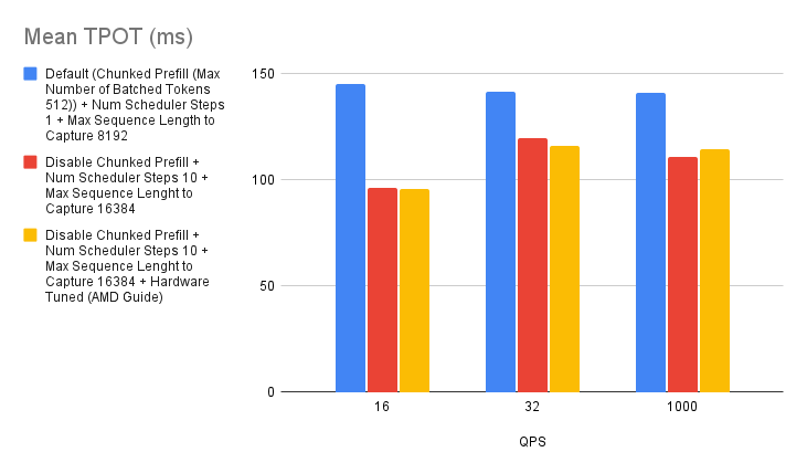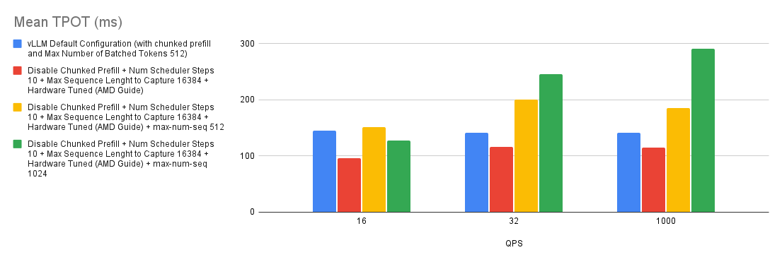Based on the experiment we ran, we found that there’s a slight improvement with tuning the chunked prefill values over disabling the chunked prefill feature. However, if you’re not sure whether to enable chunked prefill or not, simply start off by disabling it and you should generally expect better performance than with using the default settings. This is specific to MI300X GPUs.